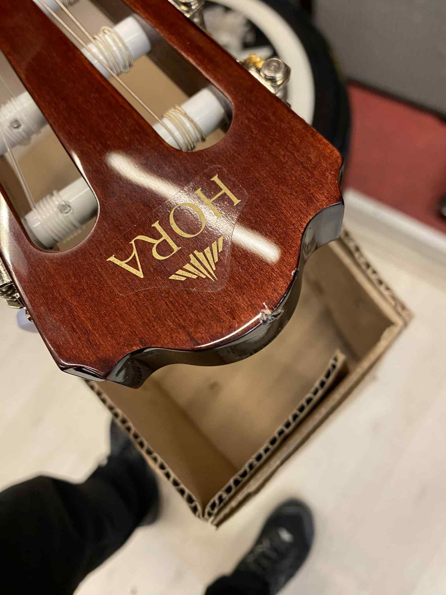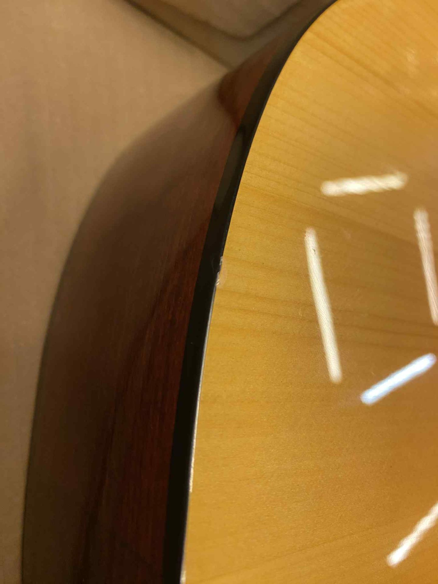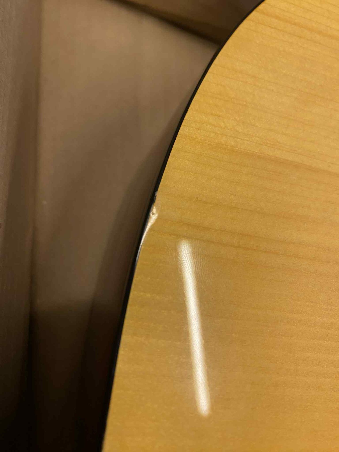 Chitara prezintă o urmă de lovitură pe partea superioară și o zonă ciobită reparată pe corp.