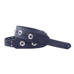 Curea pentru chitară electrică sau acustică și chitară bass, realizată exclusiv din piele naturală de calitate superioară de bovină, ornamentată cu butoni metalici nickelati (conchos), terminații în piele naturală de calitate, sistem de reglare a lungimii RAS, suport interior pentru pene.