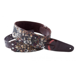 Curea pentru chitară realizată cu materiale ecologice și tehnologie modernă, caracterizată de un motiv inspirat din cărțile de tarot, cu suport în latex de mare densitate (5 mm grosime) și partea interioară în microfibră, sistem de reglare RAS, suport pentru pene încorporat, terminații din piele sintetică și greutate redusă.