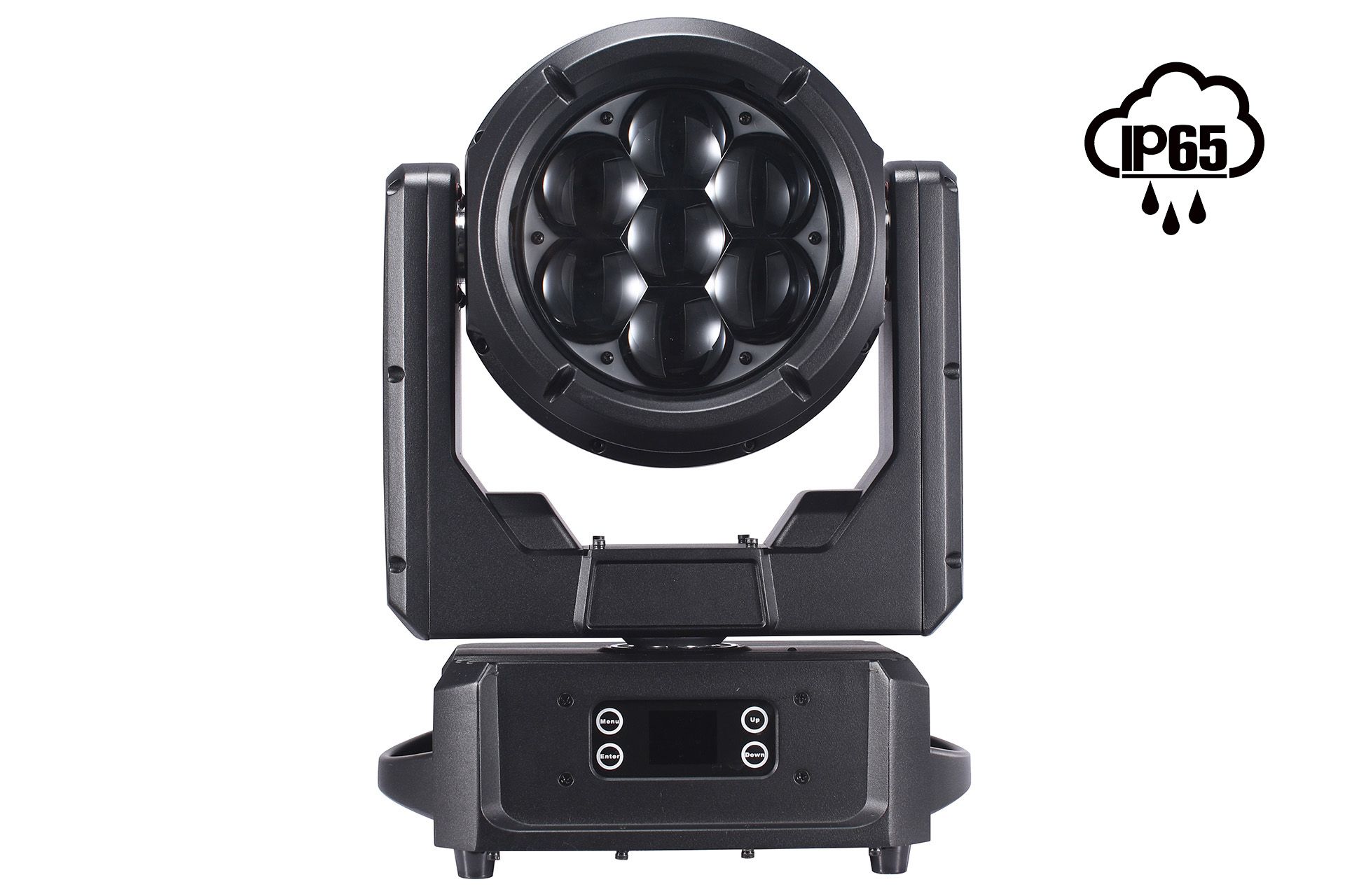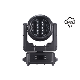Moving Head Wash/Beam compact și puternic, cu protecție IP65, 7 LED-uri RGBW de 60W fiecare, interval de zoom de la 3° la 45°, rotație a lentilei pentru efect vortex, control complet pe pixeli, protecție împotriva apei și funcționare silențioasă, CTO reglabil între 2500K și 8000K, luminozitate de 28000lm@3°@5M, greutate ultra-redusă de doar 12 kg.
