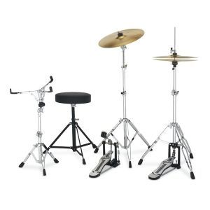 Hardware: Pedală pentru tobă mare, stativ pentru hi-hat/fus, stativ pentru tobă mică, picioare/stativ pentru cazan, scaun de tobe