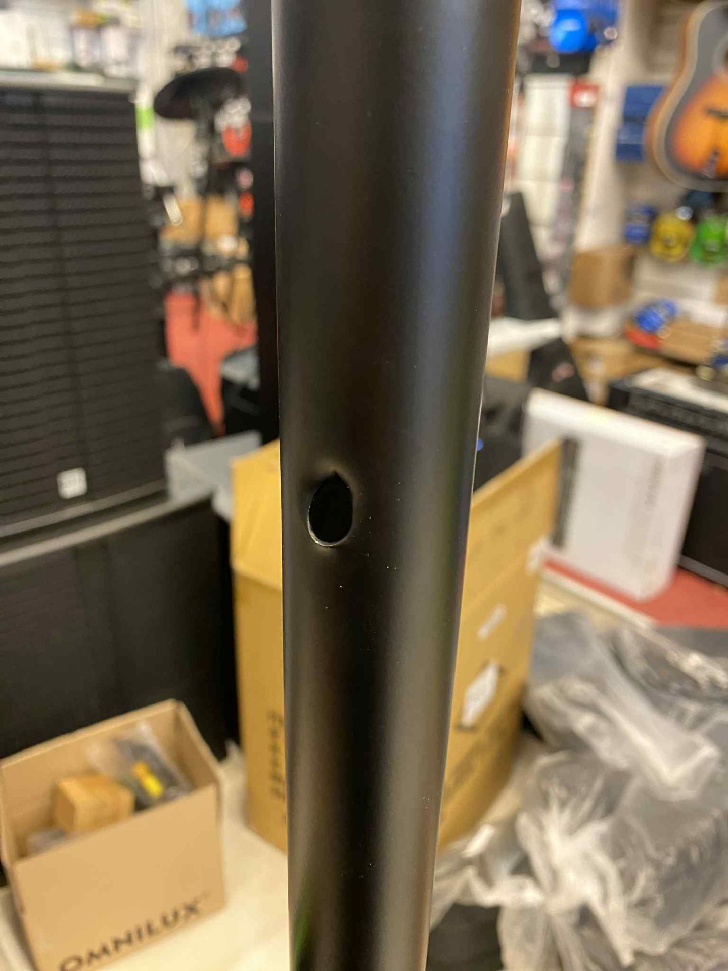 Prezintă o mică îndoitură pe tubul metalic, fără impact asupra stabilității sau funcționării.